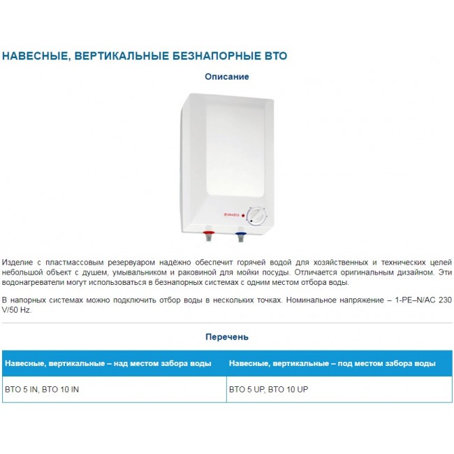 Виріб з пластмасовим резервуаром надійно забезпечить гарячою водою для господарських і технічних цілей невеликий об'єкт з душем, умивальником і раковиною для миття посуду. Відрізняється оригінальним дизайном. Ці водонагрівачі можуть використовуватися в безнапірних системах з одним місцем відбору води. У напірних системах можна підключити відбір води в декількох точках. Номінальна напруга - 1-PE-N / AC 230 V / 50 Hz.